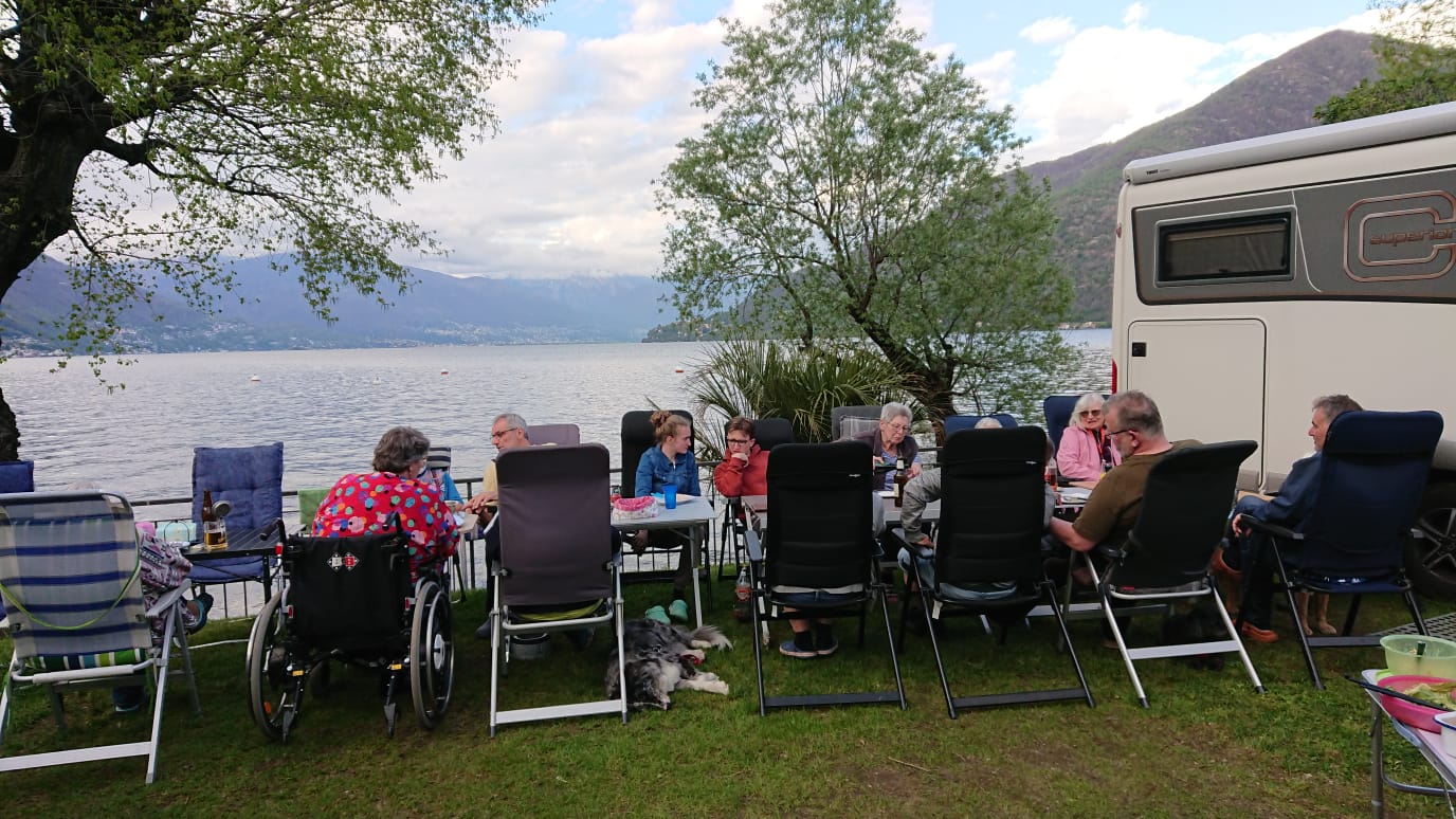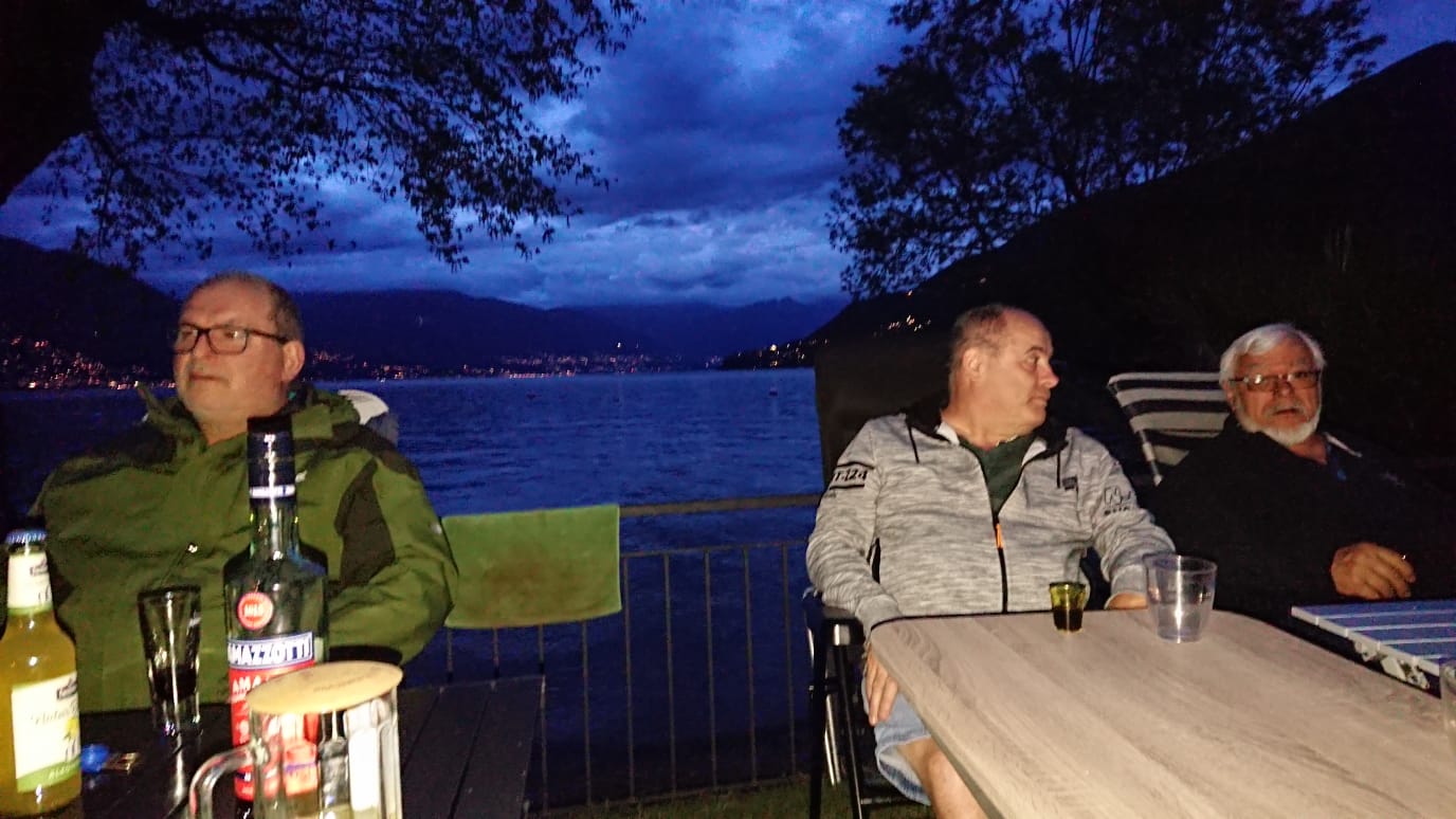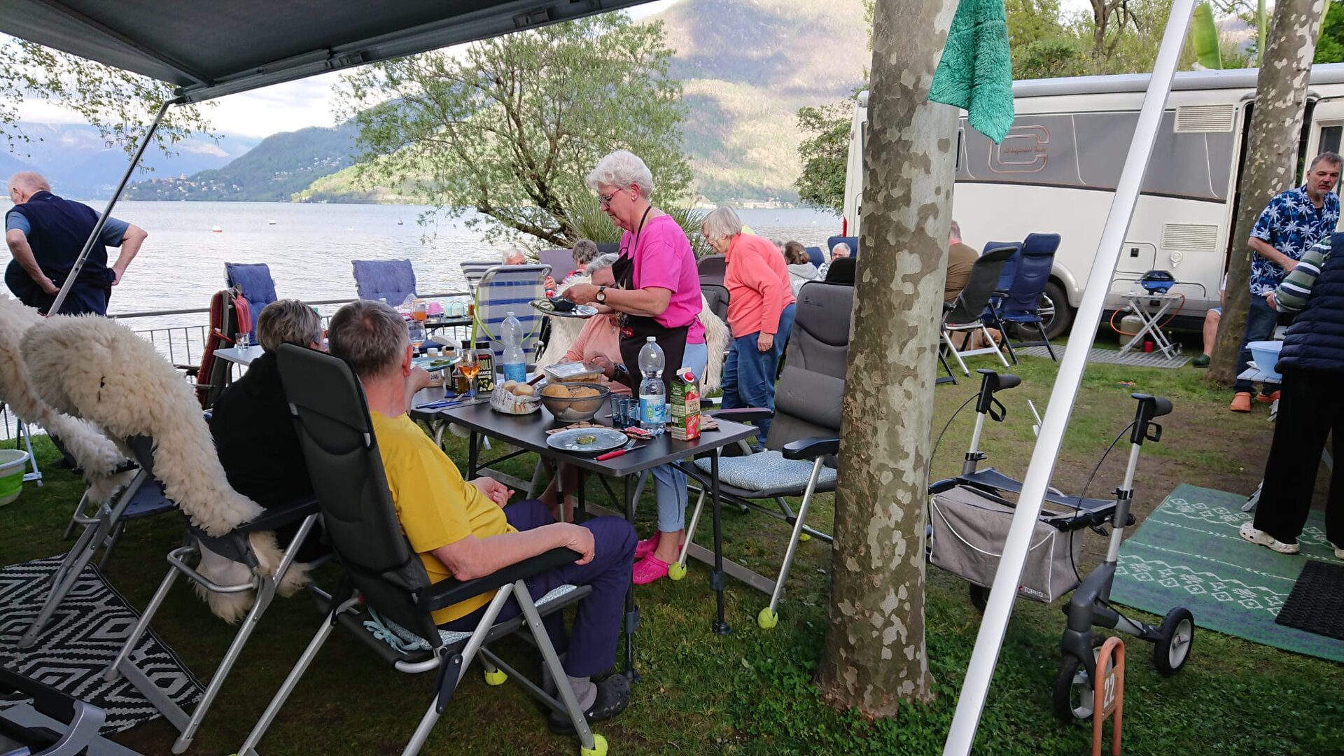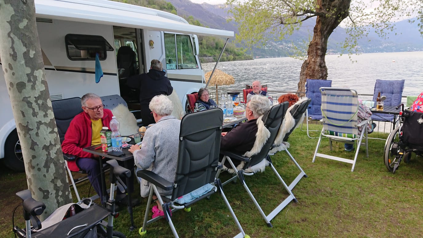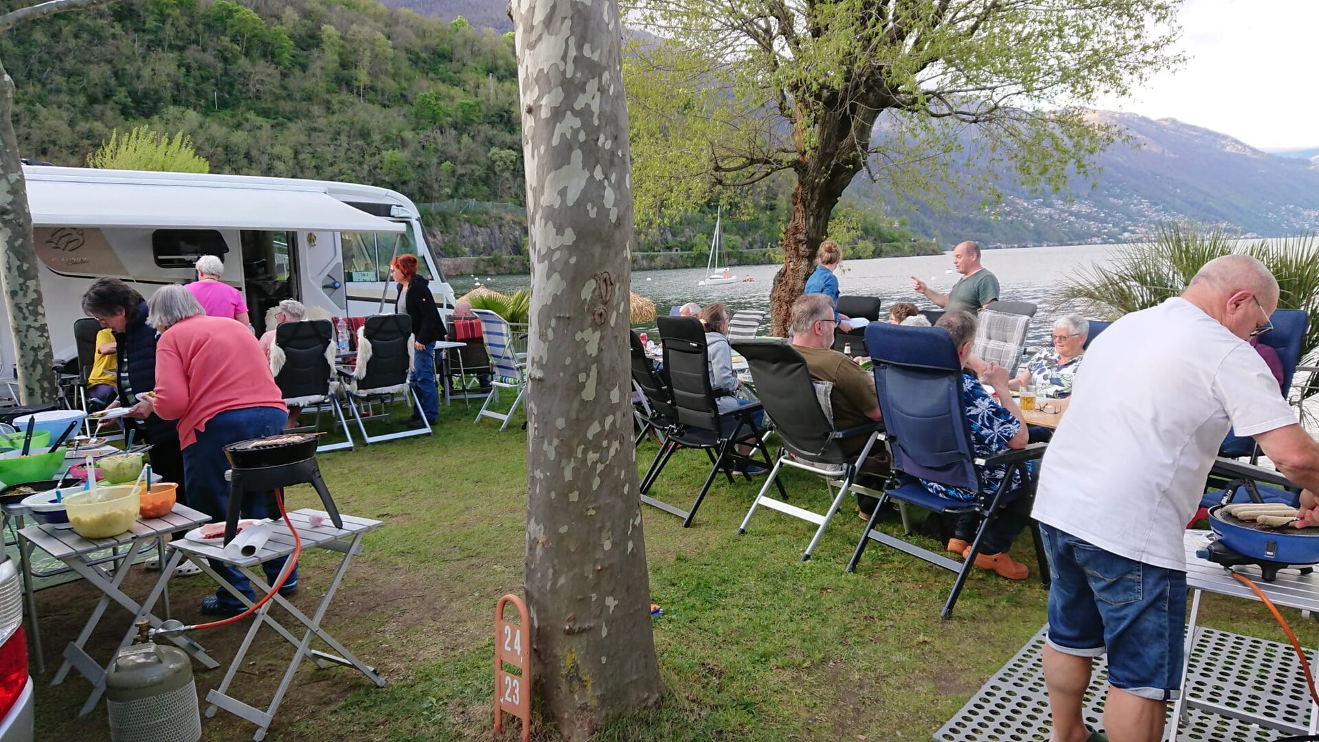 Die Caravan-Freunde Lahr im ADAC trafen sich zu Ostern mit 12 Wohnwagen und Wohnmobilen auf dem Campingplatz Paradiso in Cannobio am Lago Maggiore. Über die Woche verteilt trafen immer mehr Caravaner ein. Am Grün-Donnerstag war man dann vollzählig. Es waren Tage mit viel Regen und Gewitter. Doch zwischendrin kam auch die Sonne heraus, sodass die sonnenentwöhnte Haut des Winters rasch eine rötliche Färbung annahm. Zu Beginn der nassen Tage stellten sich 3 „Beach-Boys“ bei Regen unter den Palmblatt-Sonnenschirm. An Ostern wären sie an selber Stelle bis über das Knie im Wasser gestanden.