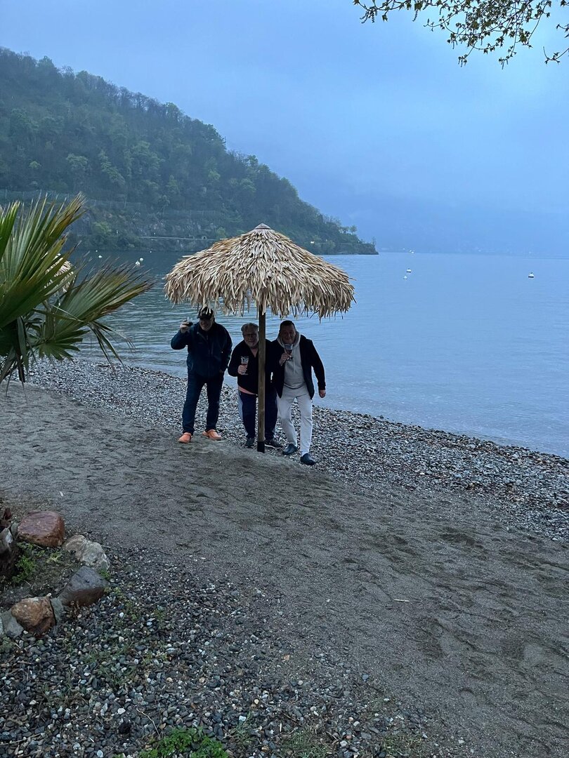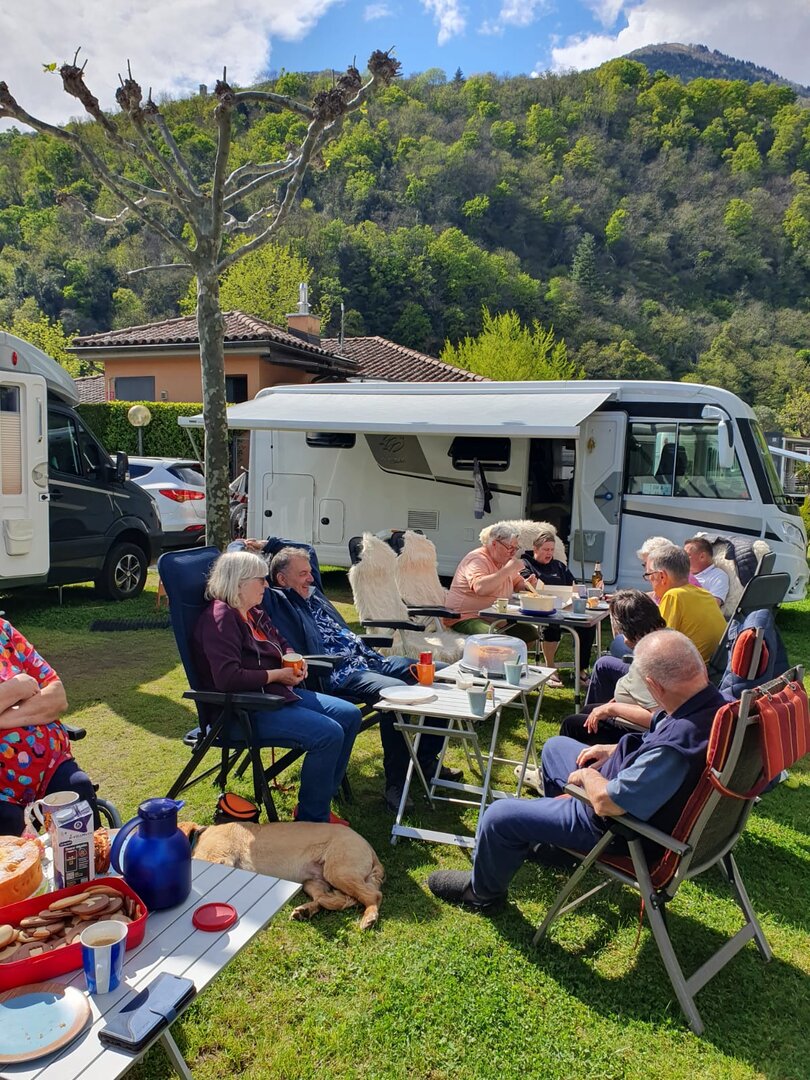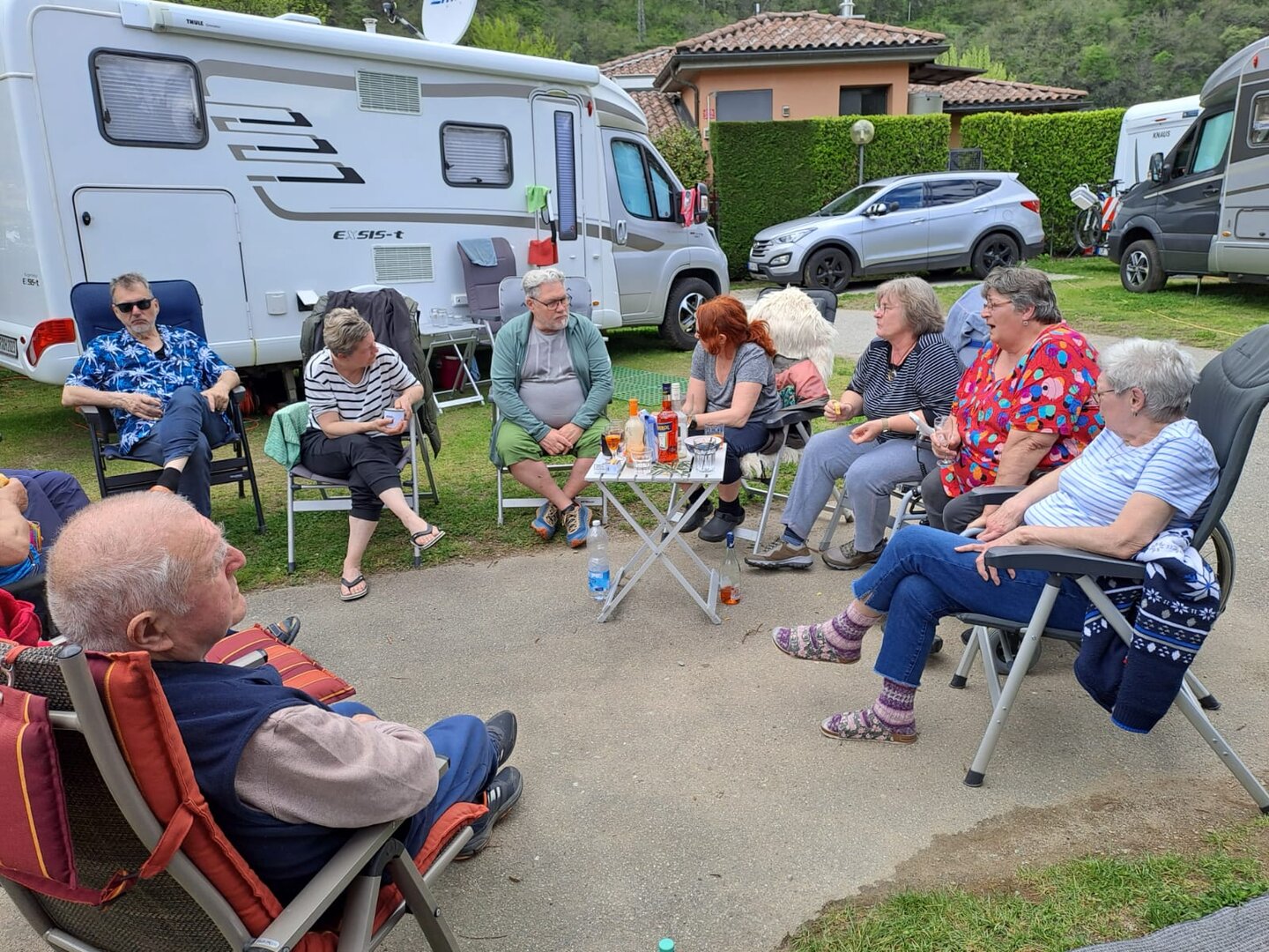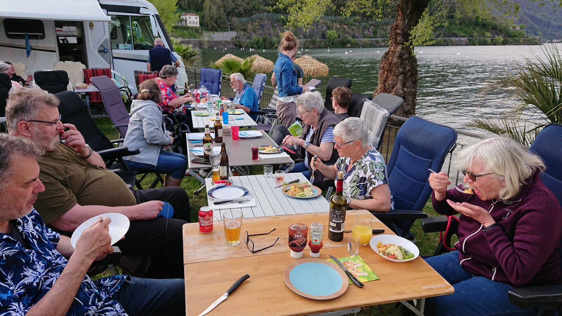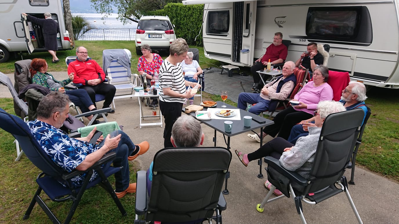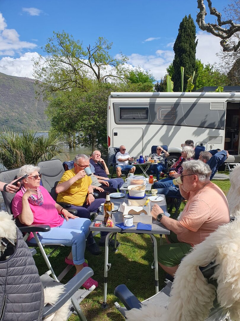 Die Caravan-Freunde Lahr im ADAC trafen sich zu Ostern mit 12 Wohnwagen und Wohnmobilen auf dem Campingplatz Paradiso in Cannobio am Lago Maggiore. Über die Woche verteilt trafen immer mehr Caravaner ein. Am Grün-Donnerstag war man dann vollzählig. Es waren Tage mit viel Regen und Gewitter. Doch zwischendrin kam auch die Sonne heraus, sodass die sonnenentwöhnte Haut des Winters rasch eine rötliche Färbung annahm. Zu Beginn der nassen Tage stellten sich 3 „Beach-Boys“ bei Regen unter den Palmblatt-Sonnenschirm. An Ostern wären sie an selber Stelle bis über das Knie im Wasser gestanden.