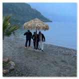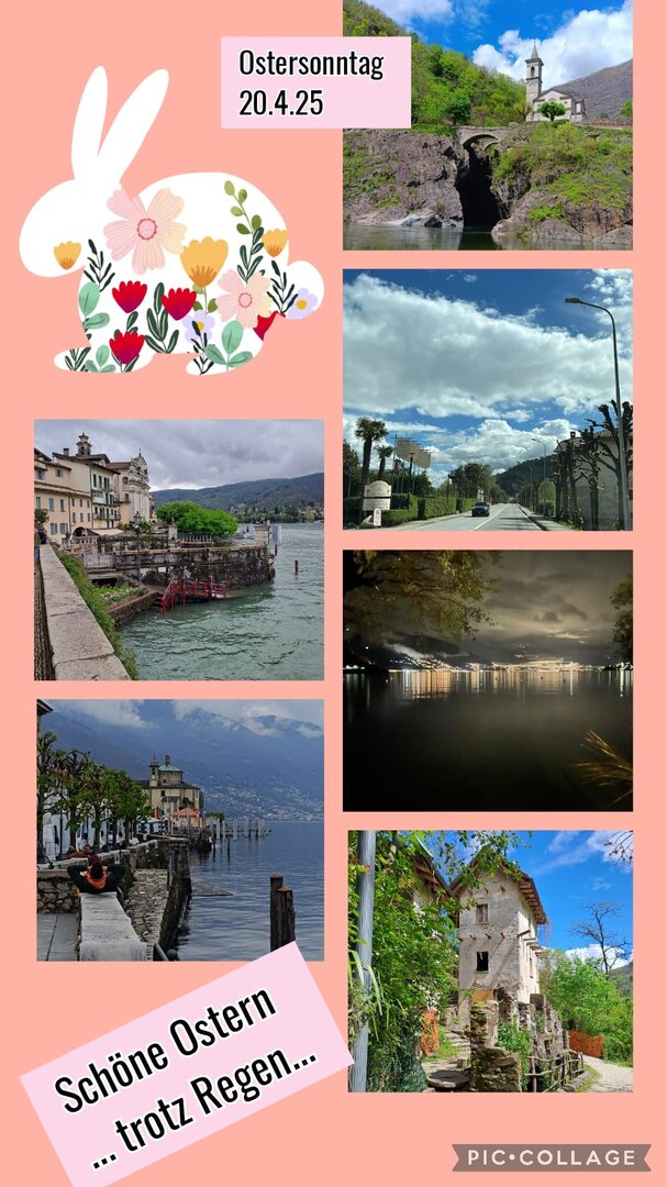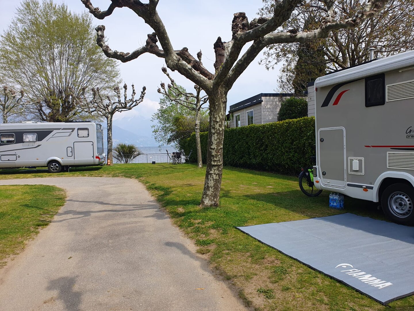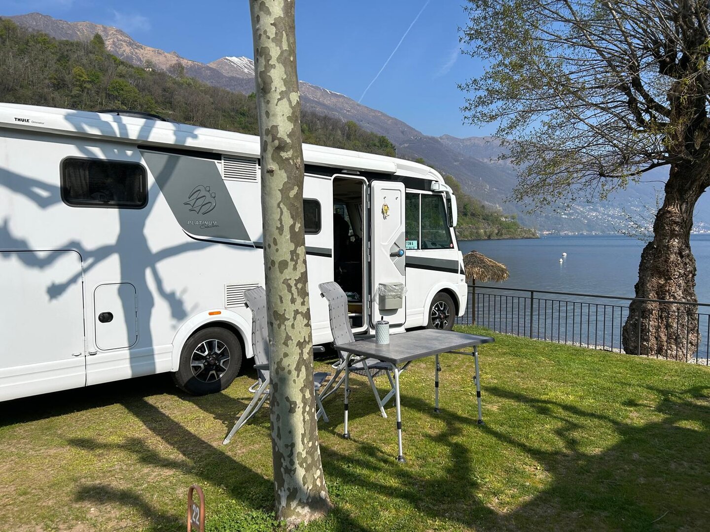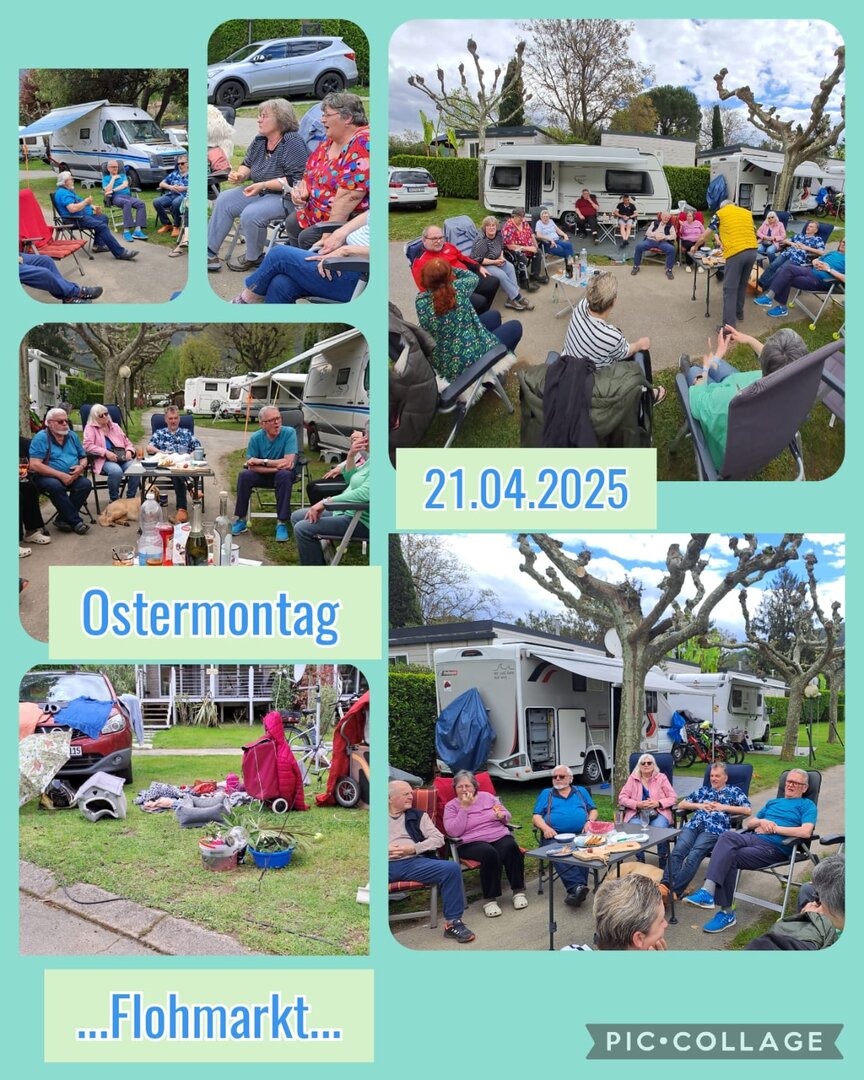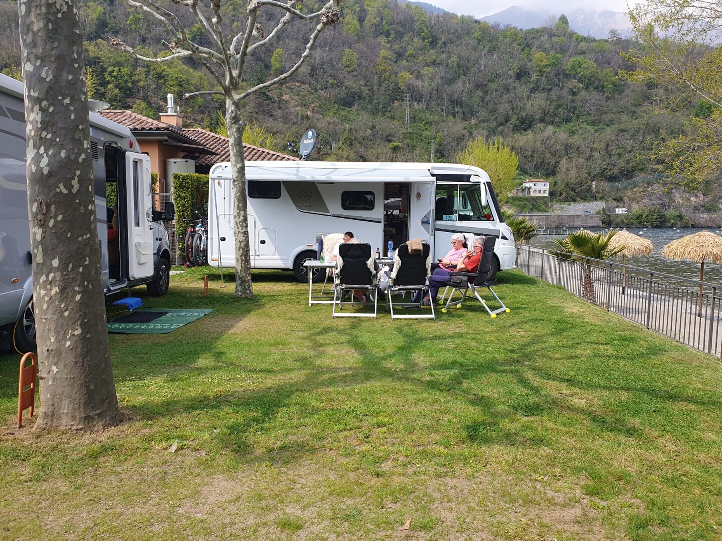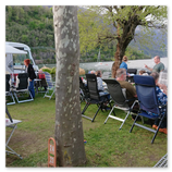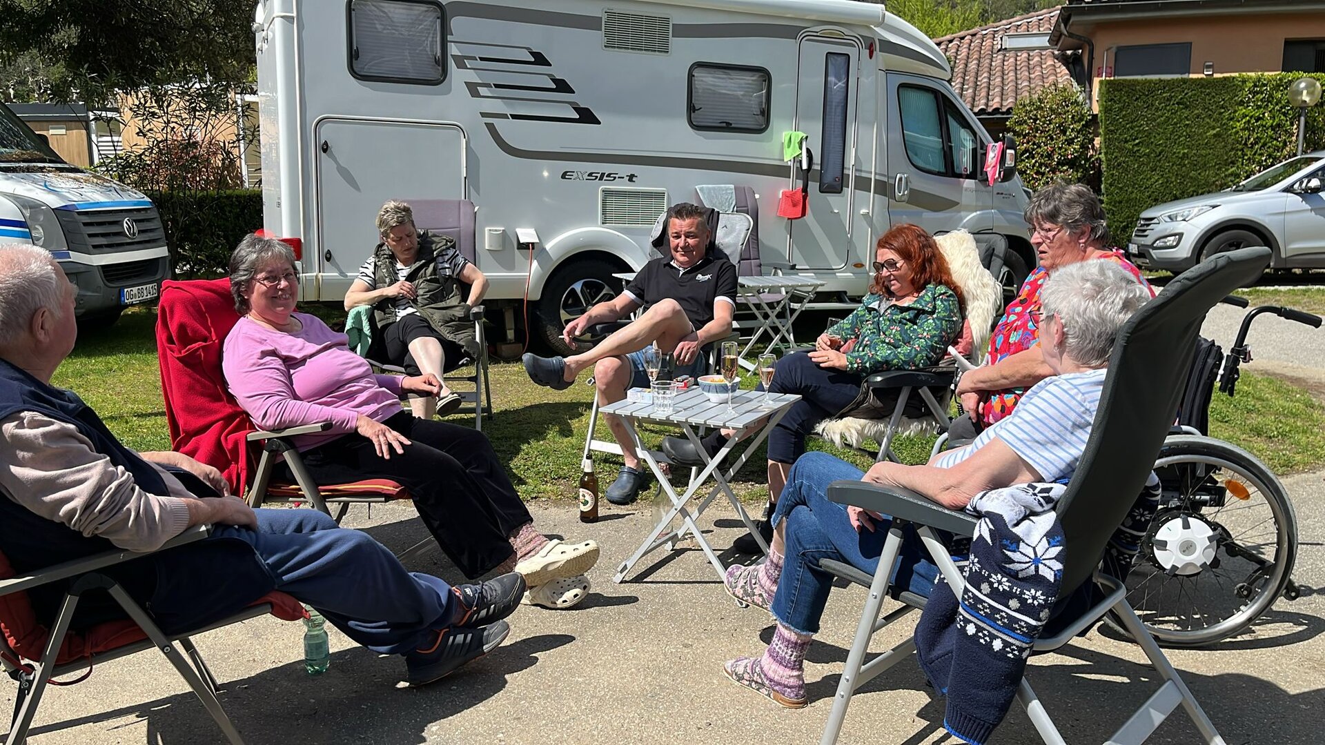 Die Caravan-Freunde Lahr im ADAC trafen sich zu Ostern mit 12 Wohnwagen und Wohnmobilen auf dem Campingplatz Paradiso in Cannobio am Lago Maggiore. Über die Woche verteilt trafen immer mehr Caravaner ein. Am Grün-Donnerstag war man dann vollzählig. Es waren Tage mit viel Regen und Gewitter. Doch zwischendrin kam auch die Sonne heraus, sodass die sonnenentwöhnte Haut des Winters rasch eine rötliche Färbung annahm. Zu Beginn der nassen Tage stellten sich 3 „Beach-Boys“ bei Regen unter den Palmblatt-Sonnenschirm. An Ostern wären sie an selber Stelle bis über das Knie im Wasser gestanden.