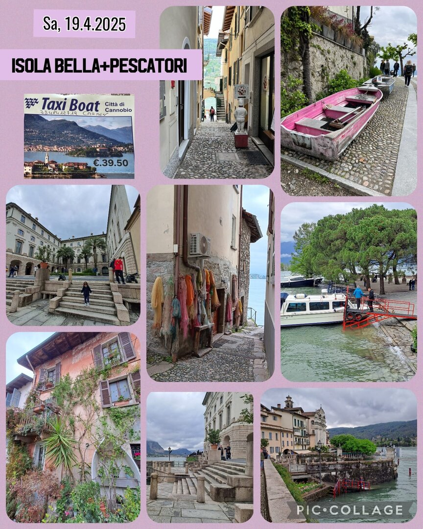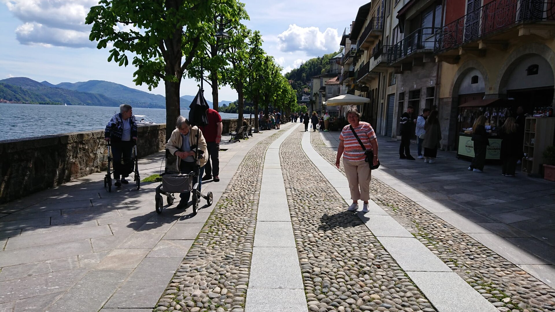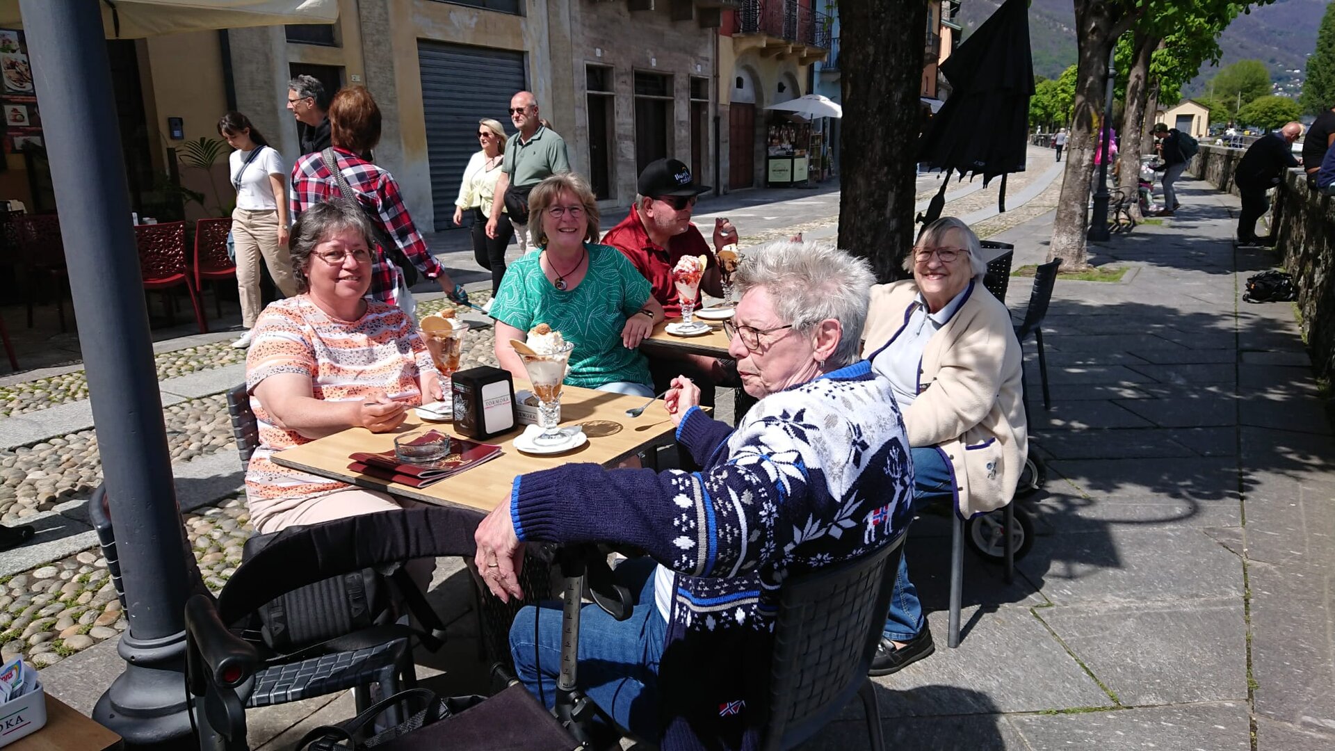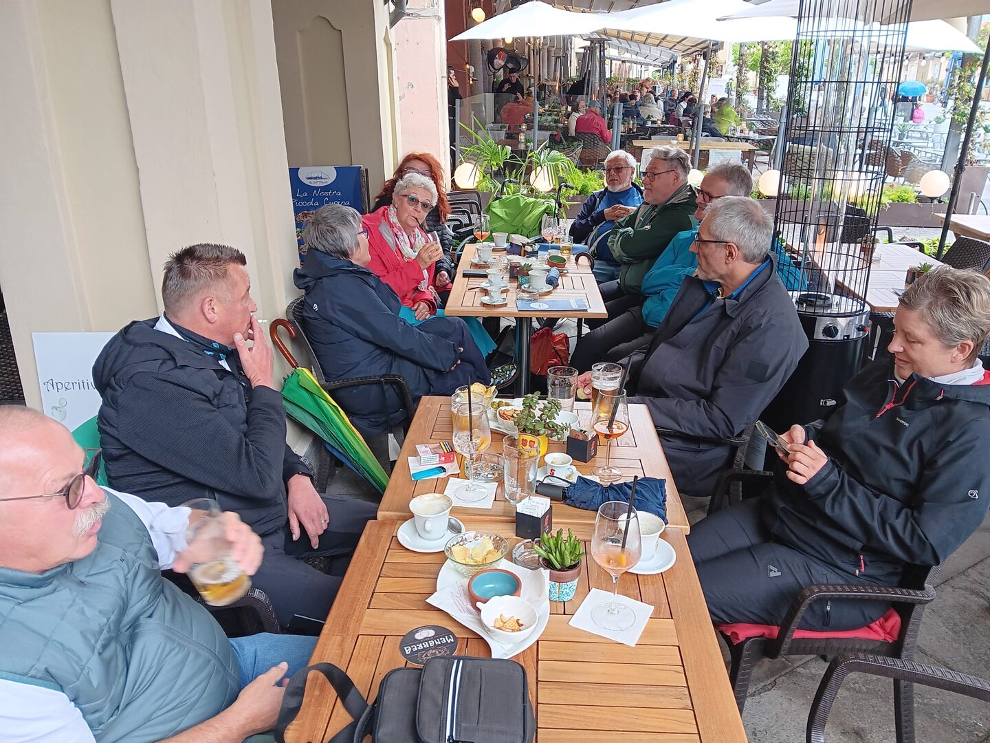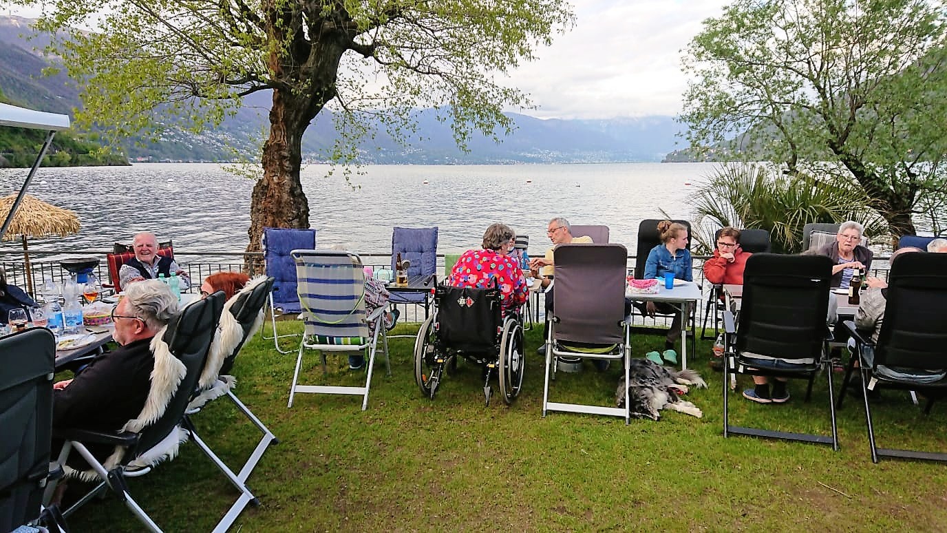 Am Samstag hatte man auf der Schifffahrt zu der Isola Bella und Isola Pescatori noch Glück mit dem Wetter. Es war zwar grau, jedoch fast regenfrei. Drei Mal wurde der Rollator auf das schwankende Boot gehievt und die älteste Teilnehmerin mit Mitte 80 kletterte hinterher. Auch auf den Inseln war das vorankommen nicht immer leicht. Doch gemeinsam klappte es ganz gut. Es war ein sehr schöner Ausflug. Gut die Hälfte schlief bei den schaukelnden Bewegungen der Bootes während der Rückfahrt ein. Abends war ein gemeinsamer Restaurantbesuch auf dem Nachbarcampingplatz angesagt.
