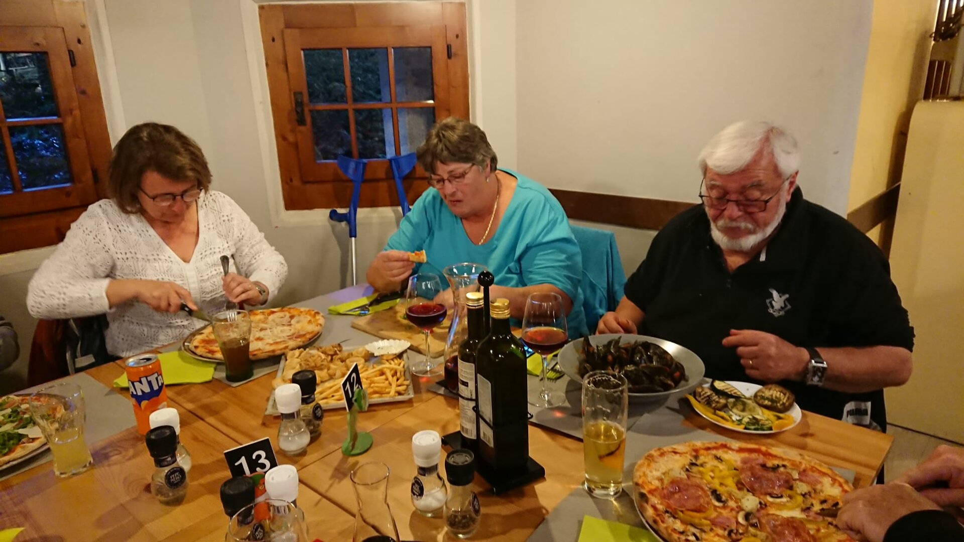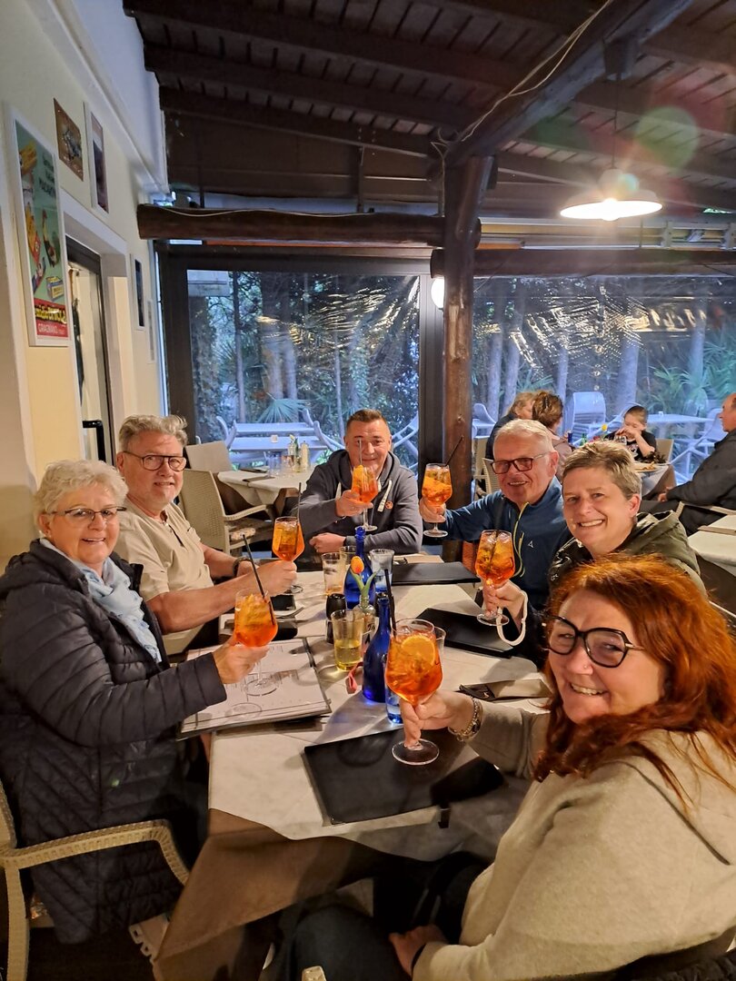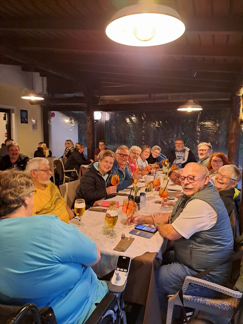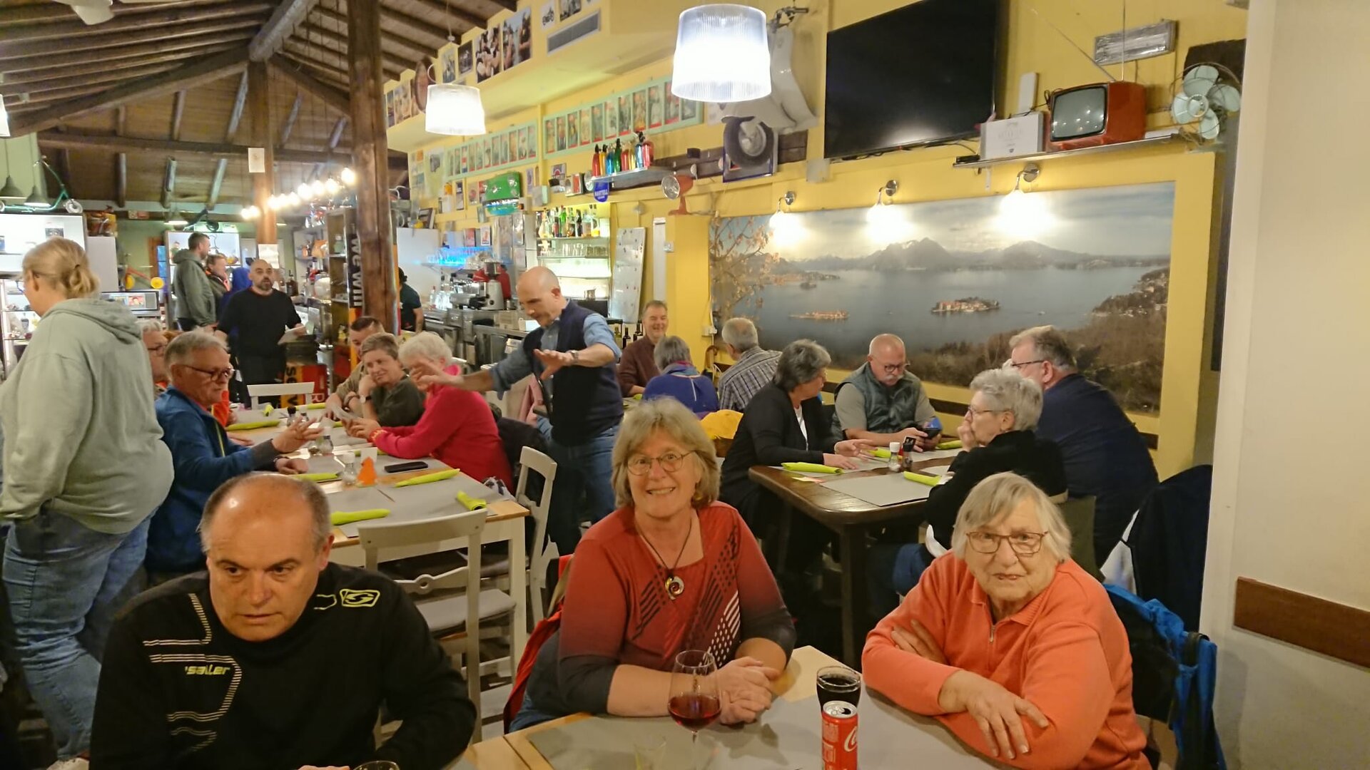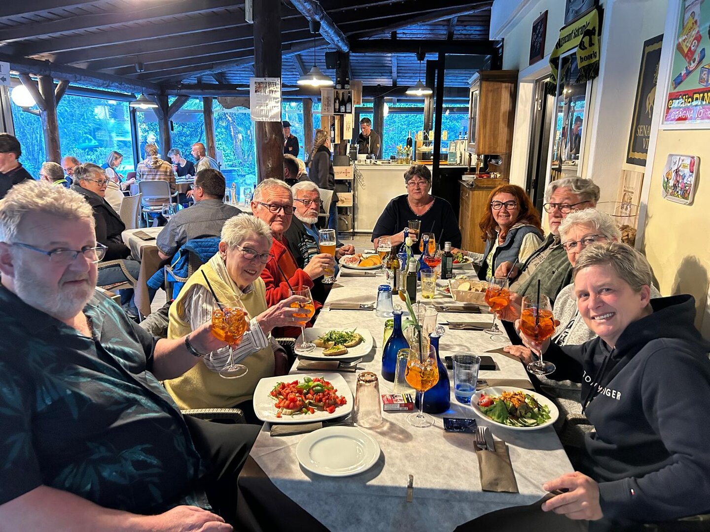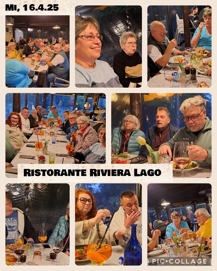 Am Samstag hatte man auf der Schifffahrt zu der Isola Bella und Isola Pescatori noch Glück mit dem Wetter. Es war zwar grau, jedoch fast regenfrei. Drei Mal wurde der Rollator auf das schwankende Boot gehievt und die älteste Teilnehmerin mit Mitte 80 kletterte hinterher. Auch auf den Inseln war das vorankommen nicht immer leicht. Doch gemeinsam klappte es ganz gut. Es war ein sehr schöner Ausflug. Gut die Hälfte schlief bei den schaukelnden Bewegungen der Bootes während der Rückfahrt ein. Abends war ein gemeinsamer Restaurantbesuch auf dem Nachbarcampingplatz angesagt.