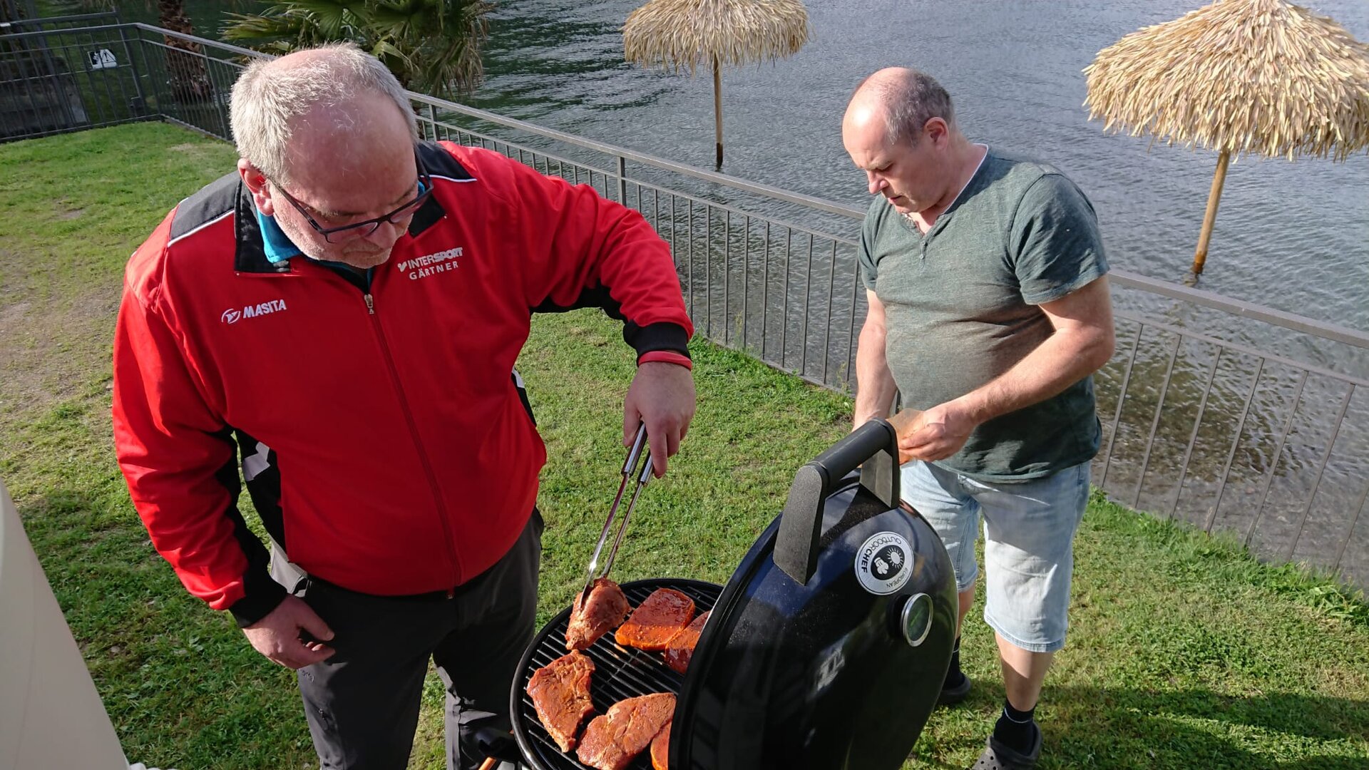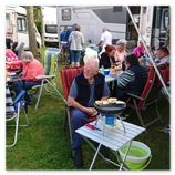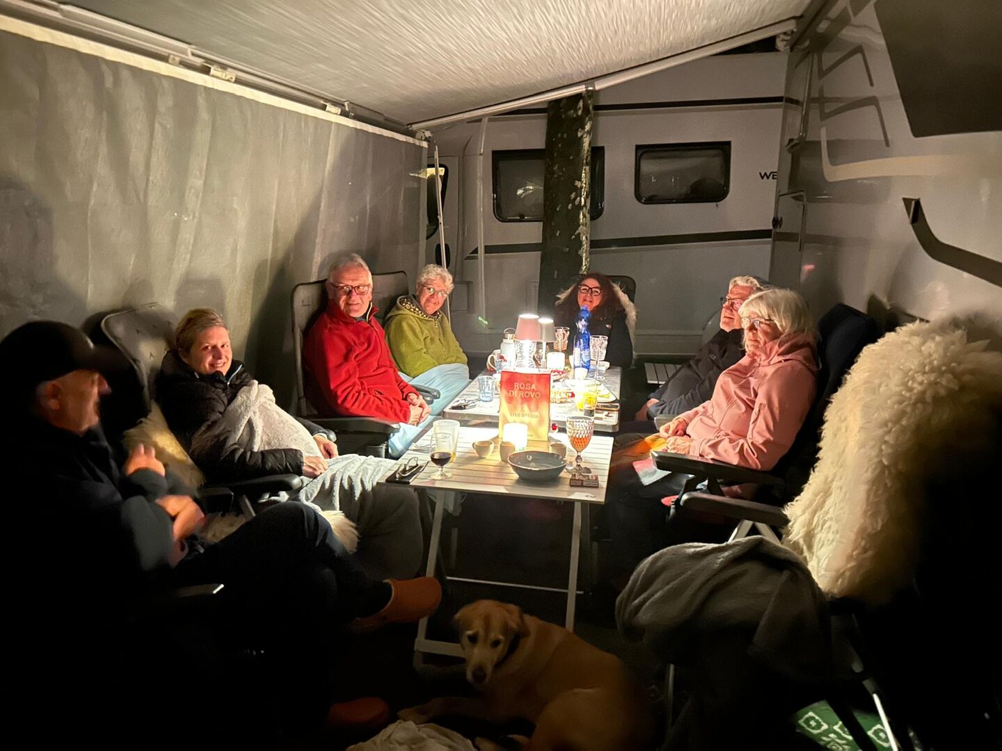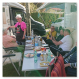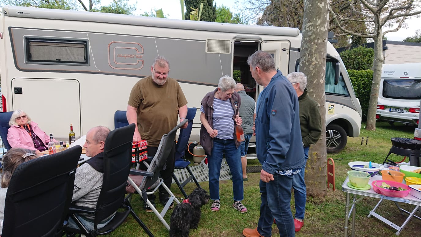 Dann der Schreck bei einem Ehepaar. Hilfe, wie kommen wir in unseren Wohnwagen. Die Tür hat sich selbst verriegelt. Schlüssel liegen drinnen, alle Fenster geschlossen. Wir müssen in den eigenen Wagen einbrechen. Die schmalste Person ist schließlich durch den Staukasten unter dem Bett gekrochen und hat die Türe von innen geöffnet. Tanja ist die Heldin des Tages.