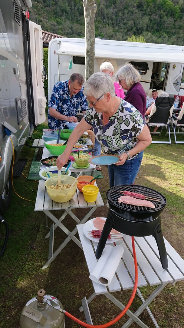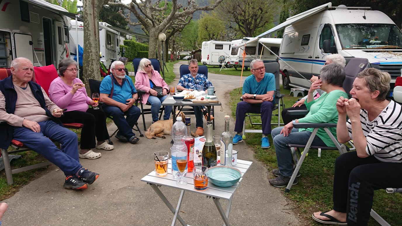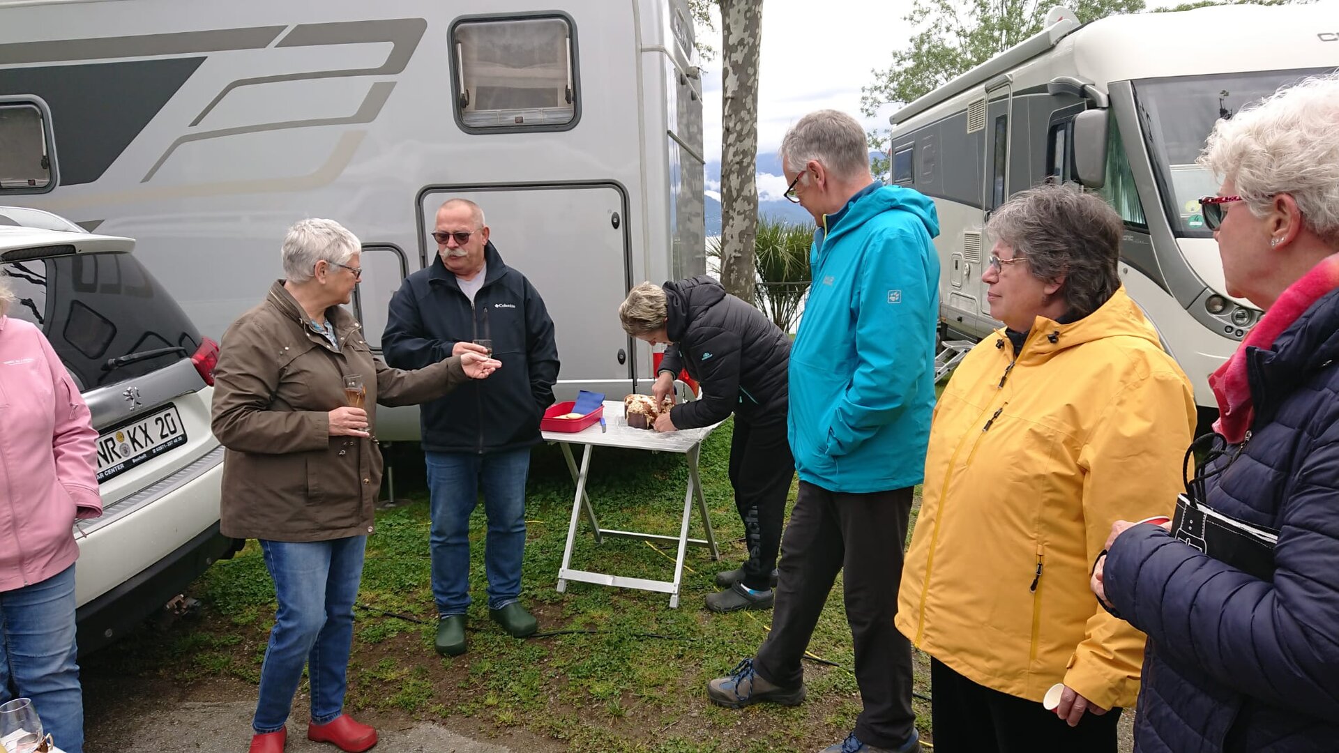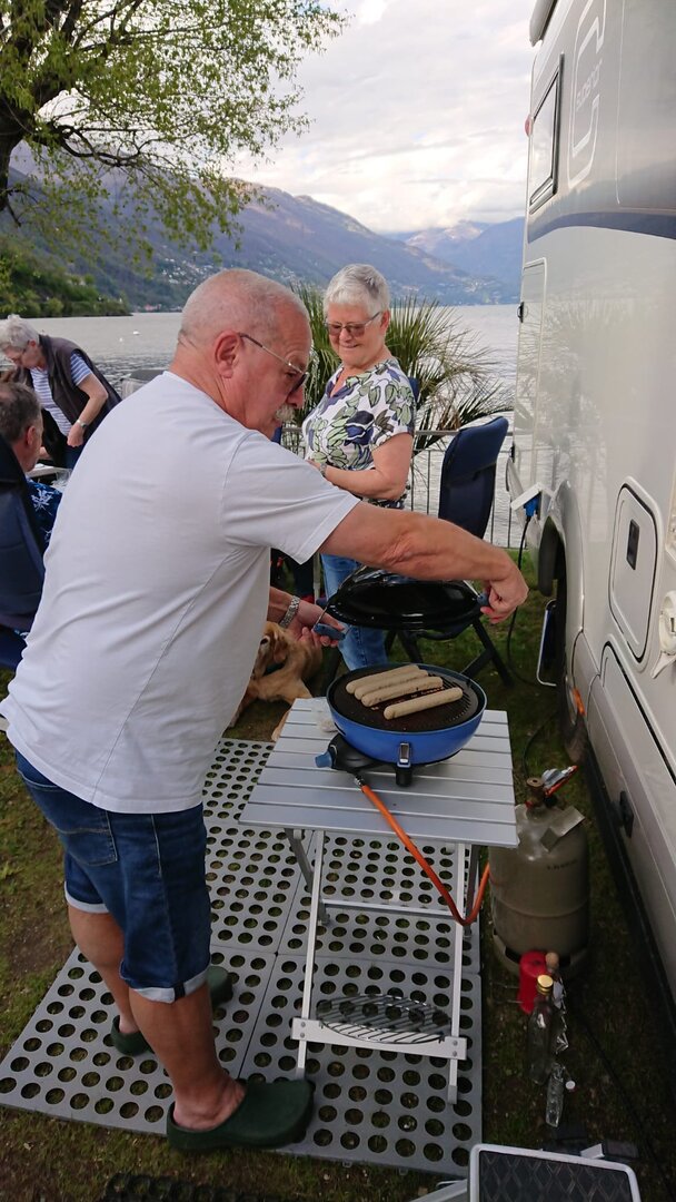Der Karfreitag begrüßte die Caravaner mit sonnigen und warmen Wetter. Die Wandertruppe begab sich am Fluss entlang nach St. Anna. Imposant stürzt der Cannobino zwischen den Felsen hervor. Oben von einer mittelalterlichen Brücke überspannt. Dort oben kam auch die Autofahrergruppe an. Sie erlebte eine abenteuerliche Fahrt. Vorsichtshalber wurden die Spiegel in den engen Gässchen eingeklappt. Nachmittags wurden dann schnell die Salate für das Grillbüffet vorbereitet, denn man hatte beschlossen das gemeinsame Grillen vorzuverlegen. Dort holte der 2. Vorsitzende Harry Weis die Ehrung für 30 Jahre Mitgliedschaft von Bella und Albert Klas nach. Der treue Begleiter Regenschirm kam die nächsten Tage immer wieder zum Einsatz.