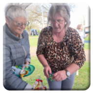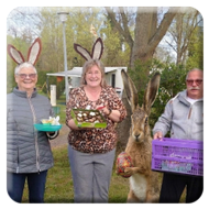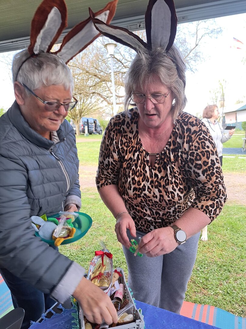 Am Ostersonntag setzten zwei Bastlerinnen Hasenohren auf und verteilten ihre aus Wolle und Filz entstandenen Hasen und Hühner zusammen mit den gefüllten Osterkörbchen des Vereines an die Mitglieder und Gäste.