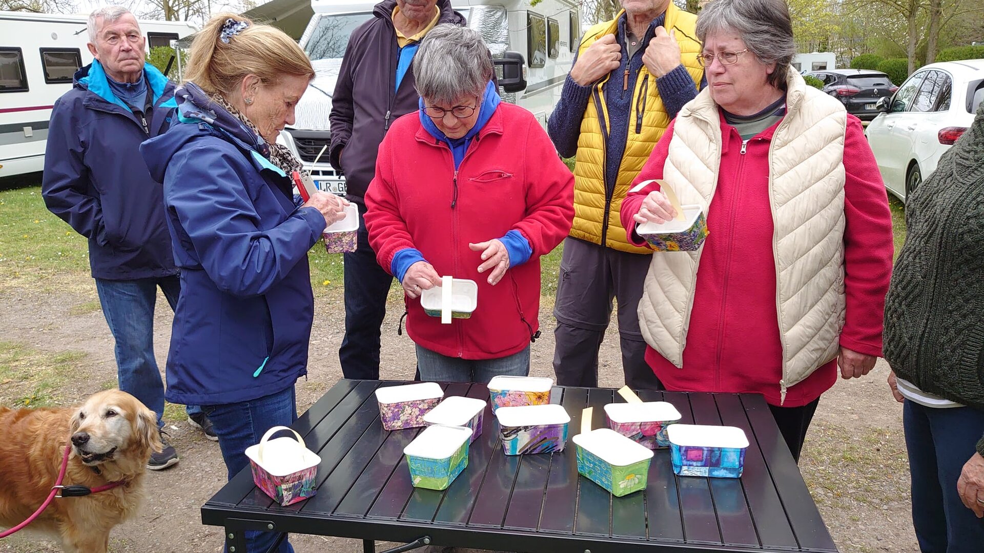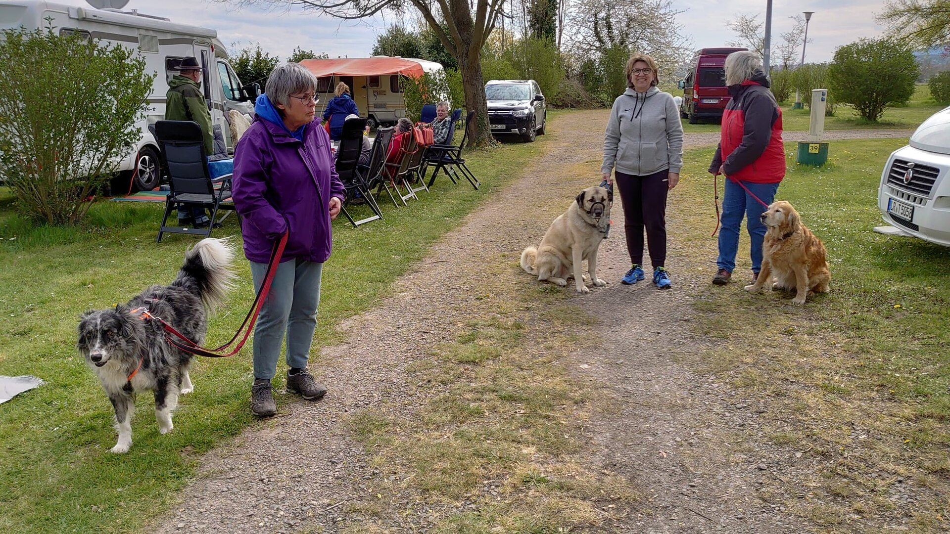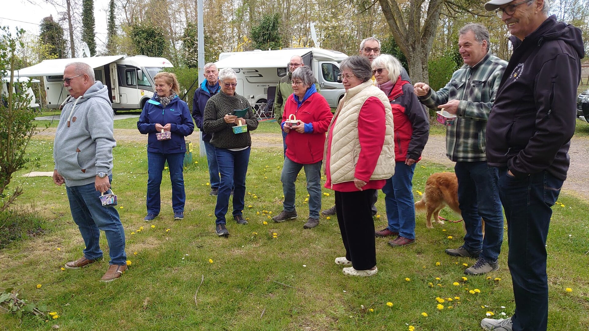 Seit über 2 Jahren erwischten die Caravan-Freunde bei jeder Ausfahrt mindestens einen Regenschauer. Dieses Mal nieselte es nur einmal kaum merklich. Dafür mussten wegen dem starken Wind immer wieder die Markisen ein und ausgekurbelt und umgewehte Stühle gesichert werden. Die Frisuren waren deshalb auch nicht top in Form. Aber da Alle so zerzaust wurden war es nicht so schlimm. Die 3 Hunde störte der Wind wenig. Sie freuten sich über die zahlreichen gemeinsamen Spaziergänge und dass es immer irgendwo ein Leckerli zu erhaschen gab.