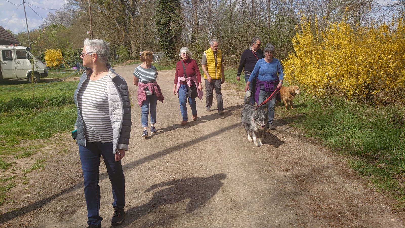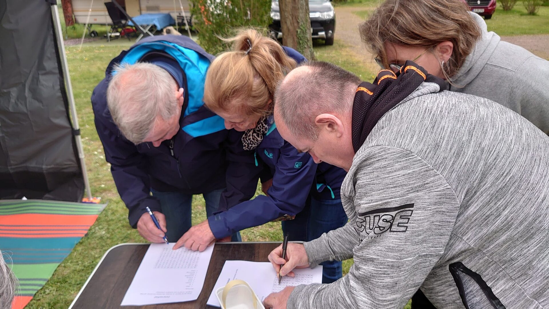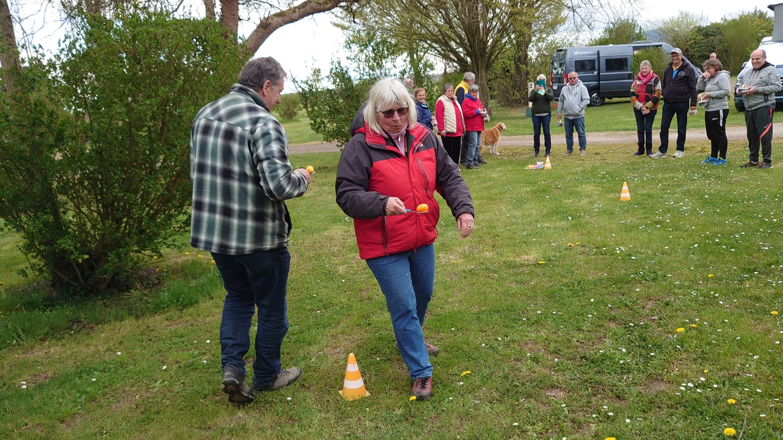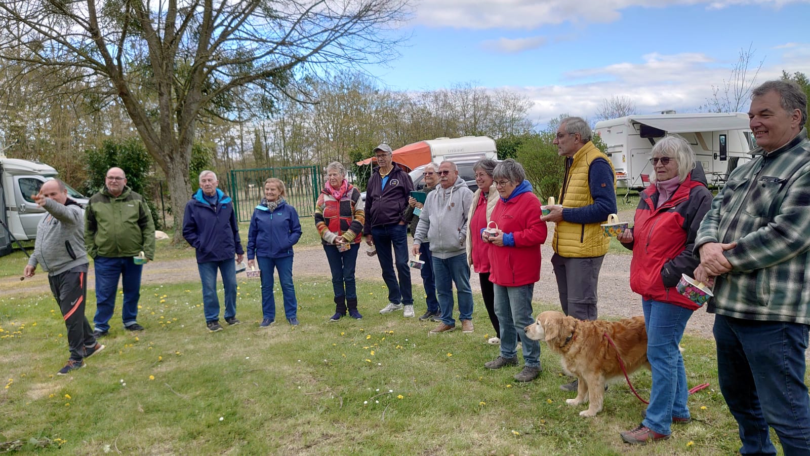 Seit über 2 Jahren erwischten die Caravan-Freunde bei jeder Ausfahrt mindestens einen Regenschauer. Dieses Mal nieselte es nur einmal kaum merklich. Dafür mussten wegen dem starken Wind immer wieder die Markisen ein und ausgekurbelt und umgewehte Stühle gesichert werden. Die Frisuren waren deshalb auch nicht top in Form. Aber da Alle so zerzaust wurden war es nicht so schlimm. Die 3 Hunde störte der Wind wenig. Sie freuten sich über die zahlreichen gemeinsamen Spaziergänge und dass es immer irgendwo ein Leckerli zu erhaschen gab.
