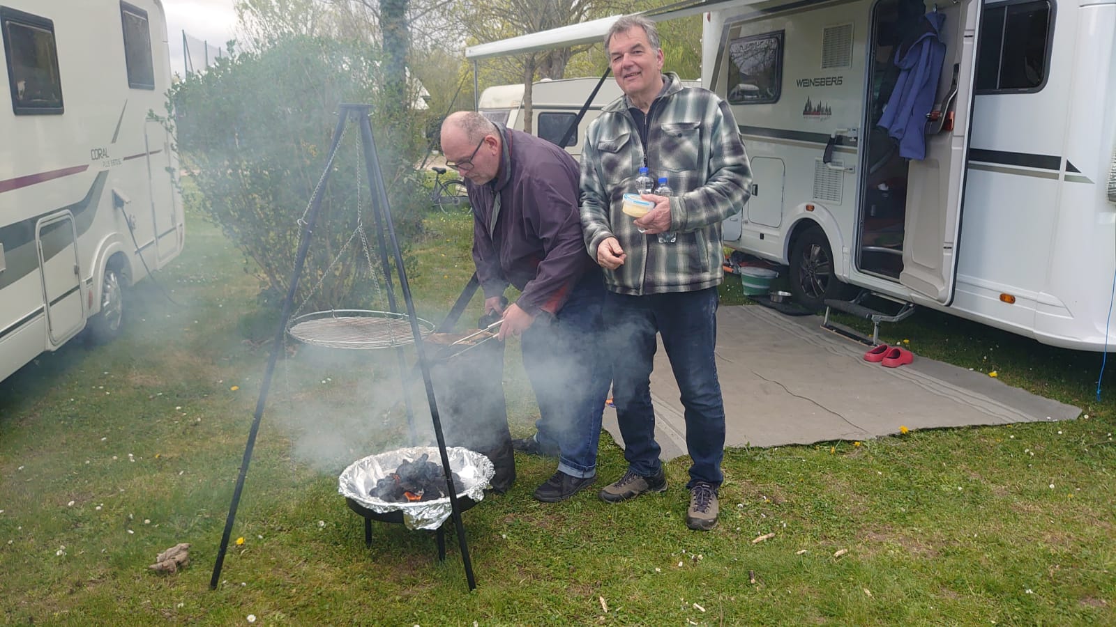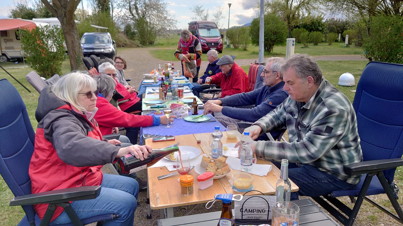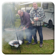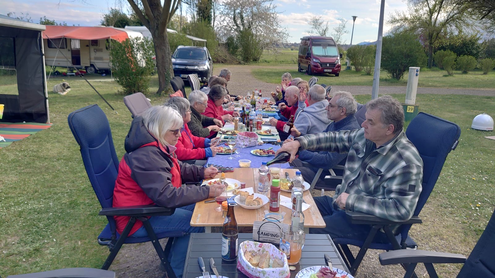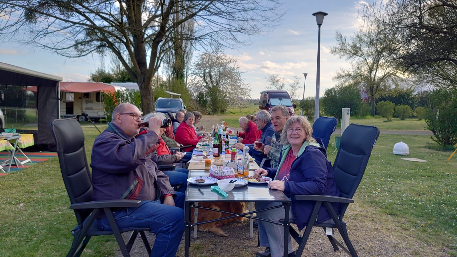 Nach einer kleinen Verschnaufpause wurden mitten auf dem Weg die Tische in einer langen Reihe aufgestellt und der Holzkohlegrill von Georg Pfaff entzündet. Jeder legte sein mitgebrachtes Grillgut auf den Schwenkgrill. Schnitzel, Steaks und Spieße lagen nebeneinander. Das ein Filetstück auf einem fremden Teller landete wurde vom Besitzer schnell gemerkt und zurückbeordert. Die unterschiedlichsten Salate aus den Camperküchen waren zu einem Büffet aufgebaut. Zum Abschluss machten Ramazotti und Eierlikör als Verdauerle die Runde.