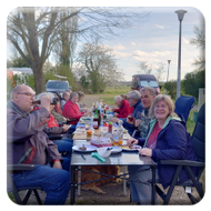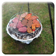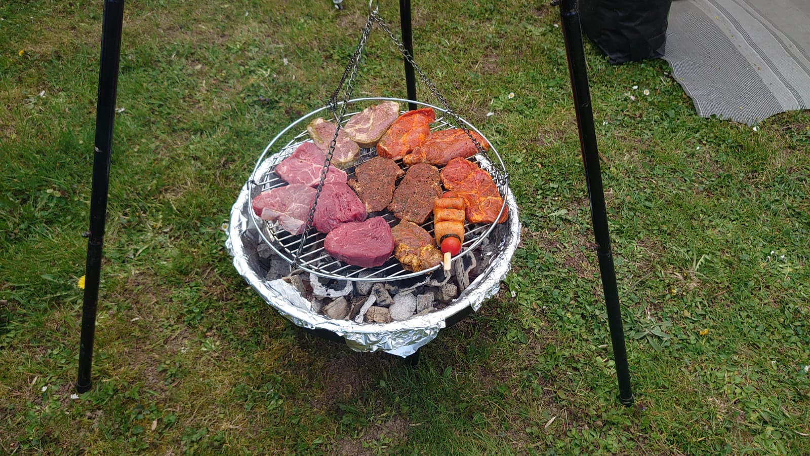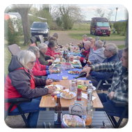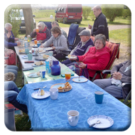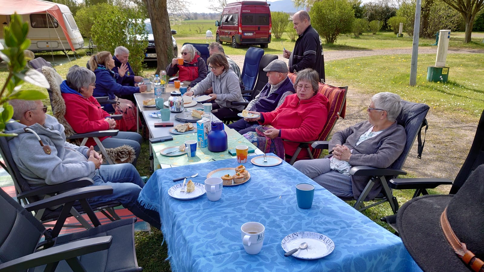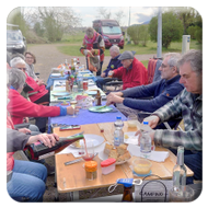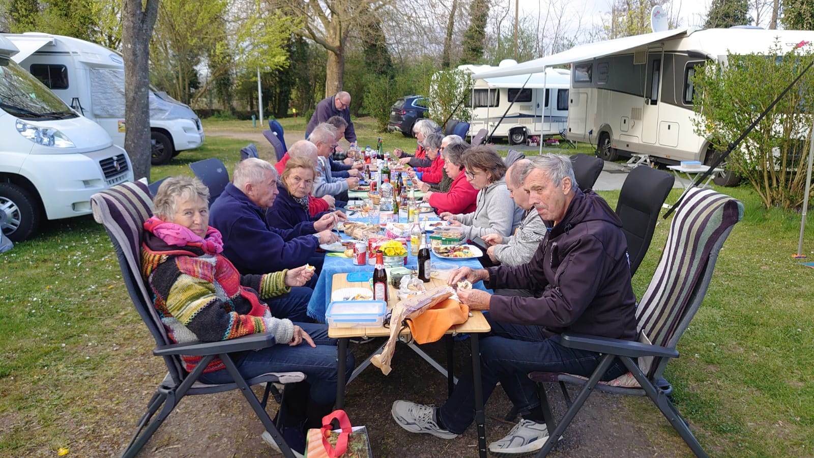 Nach einer kleinen Verschnaufpause wurden mitten auf dem Weg die Tische in einer langen Reihe aufgestellt und der Holzkohlegrill von Georg Pfaff entzündet. Jeder legte sein mitgebrachtes Grillgut auf den Schwenkgrill. Schnitzel, Steaks und Spieße lagen nebeneinander. Das ein Filetstück auf einem fremden Teller landete wurde vom Besitzer schnell gemerkt und zurückbeordert. Die unterschiedlichsten Salate aus den Camperküchen waren zu einem Büffet aufgebaut. Zum Abschluss machten Ramazotti und Eierlikör als Verdauerle die Runde.
