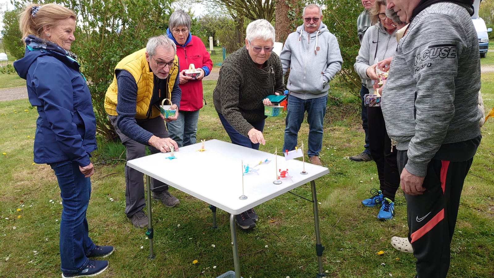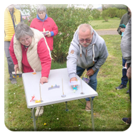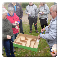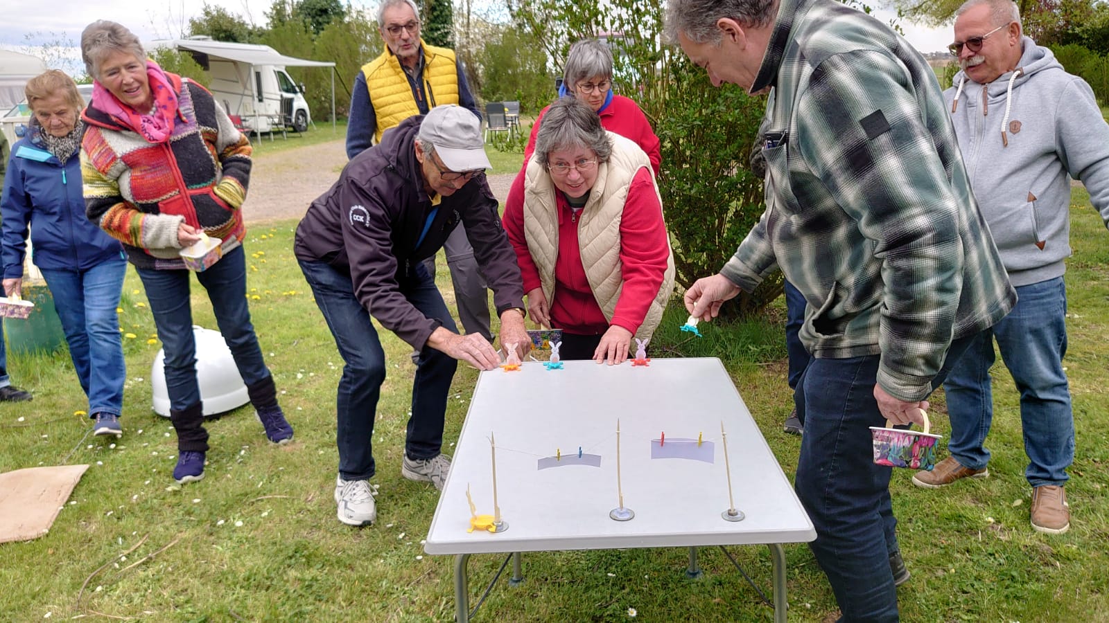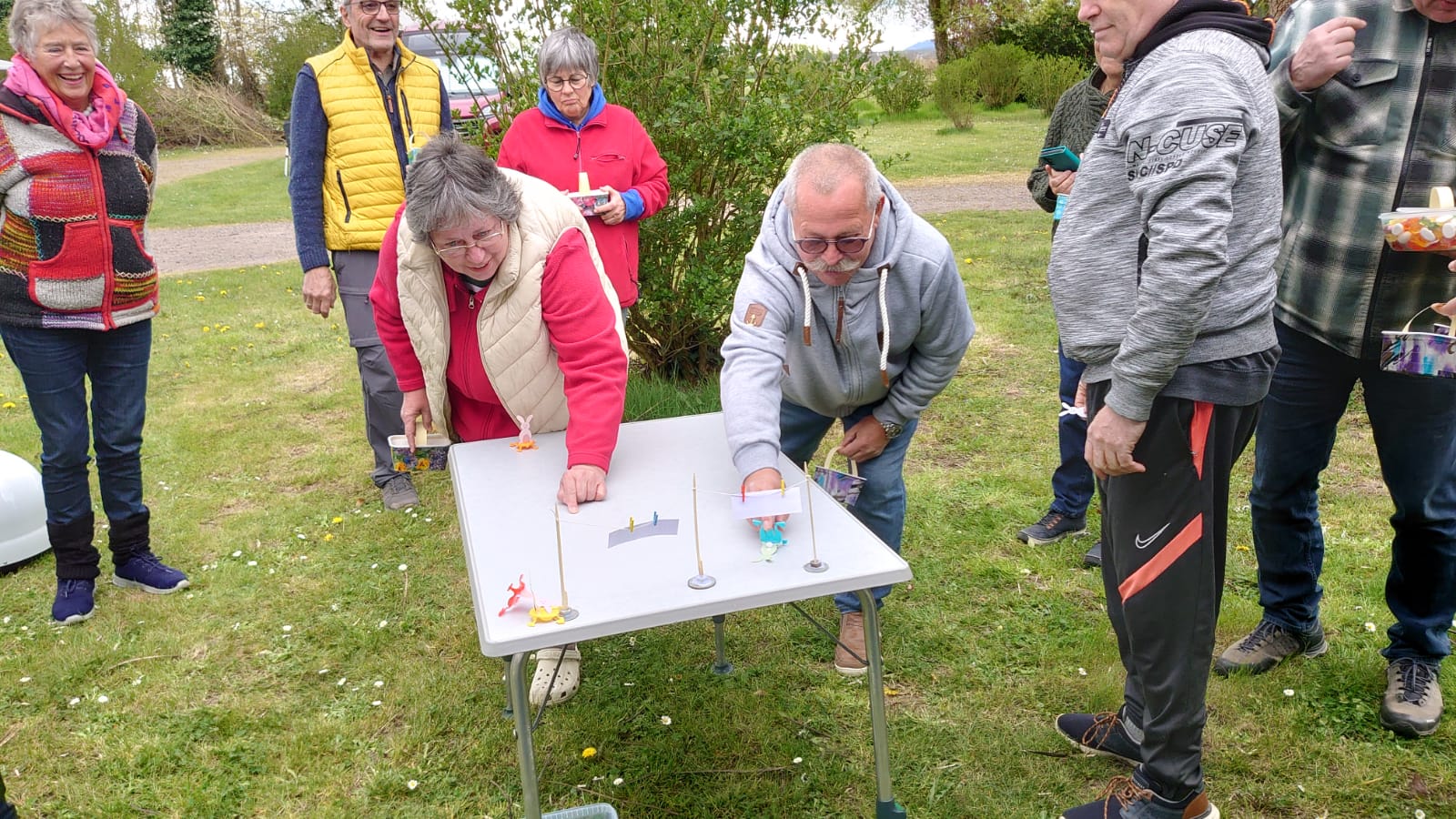 Damit ein bisschen Bewegung in die Truppe kam veranstalteten Yvonne Pfaff und Michaela Gottlieb am Samstag-Nachmittag eine Oster-Olympiade. Die 16 Teilnehmer zogen gemeinsam von Station zu Station auf dem Rundkurs über den Platz. Es wurden Sammelkörbchen gebastelt, Wörter enträtselt und Spiele mit österlichem Bezug bestritten. So wurden Darts auf Luftballons geworfen, Osterhasen hüpfen gelassen und ein größeres Plastikei über die Schnur geworfen. An jeder Station gab es in dem Körbchen Osternaschereien zu sammeln. Bunte Eier erhielt man bei dem Eierlauf und dem Kuller-Labyrinth. Alle hatten viel Spaß bei den Aktionen wobei es nicht um Platzierungen ging. Nach einer Stunde wurden den Teilnehmern Plaketten in Form Cornflakes-Schokomedallien übergeben und ein gemeinsames Siegerfoto geschossen.